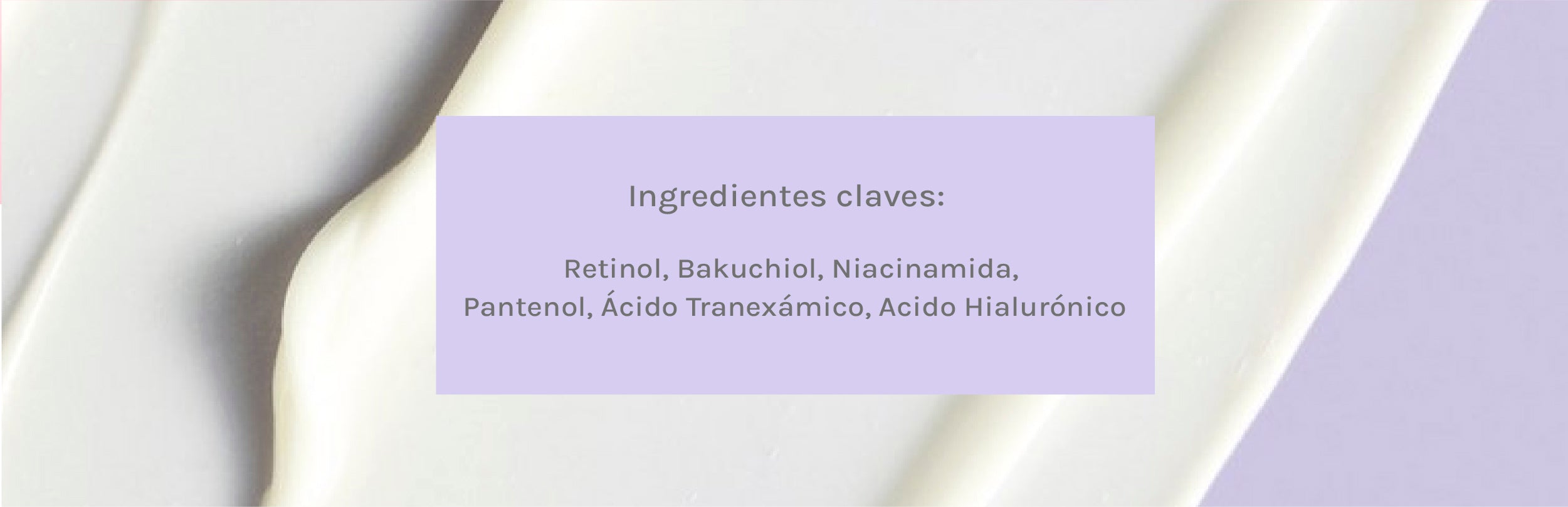 Retinol: el activo anti-envejecimiento por excelencia, que mejora la textura y apariencia de la piel. Atenúa arrugas, unifica el tono de la piel y ayuda a tener una piel mas firme y joven.