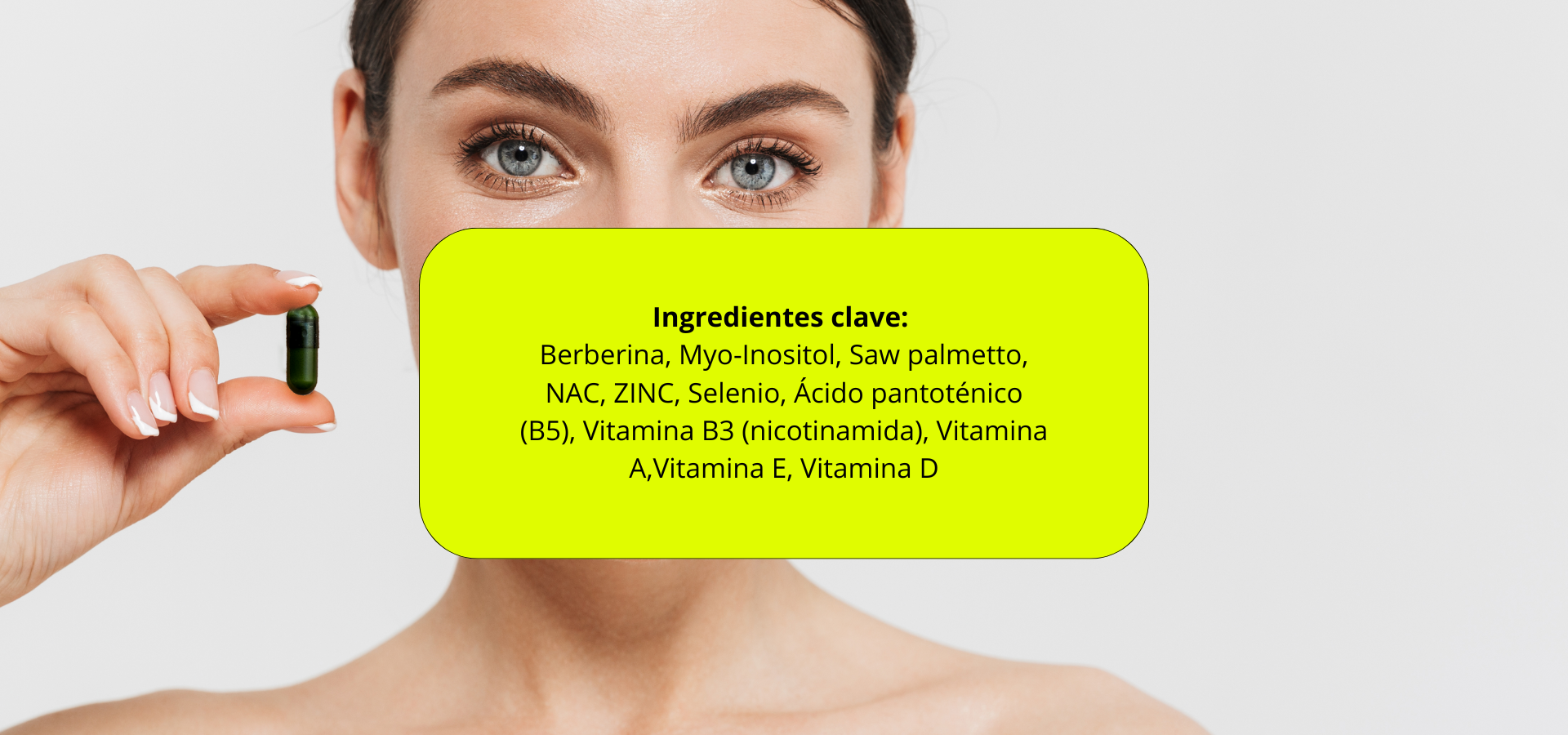 Ingredientes: Inositol, Berberis aristata extracto seco de raiz(98% berberina), N-acetil cisteína, Sabal serrulata extracto seco(45% ácidos grasos), fosfato de calcio (antiaglomerante) , estearato magnésico (antiaglomerante) , niacinamida, sulfato de zinc, alfa tocoferil acetato, pantotenato cálcico, retinol acetato, seleniometionina, colecalciferol, fosfato dicálcico, grasas vegetales saturadas, silicio, lecitina de girasolComponentes de la Cubierta de la cápsula: hidroxipropilmetilcelulosa, clorofilina de sodio y cobre