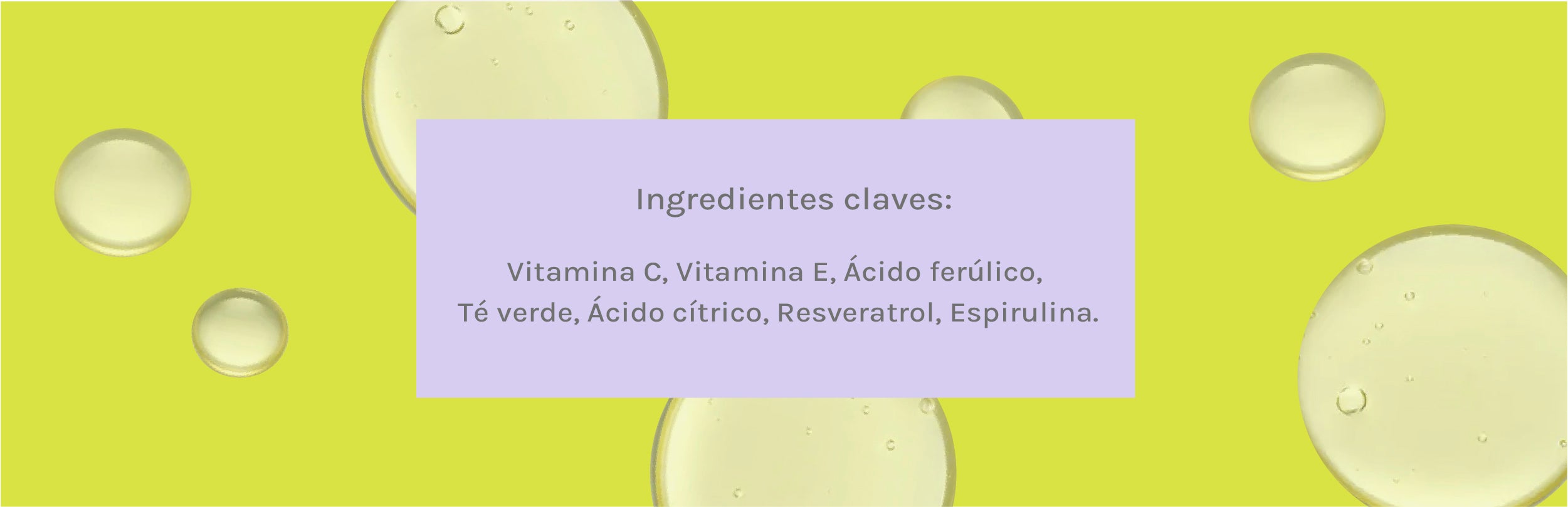 Questo booster concentrato di antiossidanti come Vitamina C, Vitamina E, Tè Verde, Acido Ferulico, Zinco, Spirulina, Resveratrolo e Acido Citrico. Aiutano la tua pelle a recuperare quell'aspetto energico e radioso allo stesso tempo che aiuta a ridurre le rughe, attenuare le macchie, uniformare il tono della pelle e combattere i radicali liberi che sono le principali cause dell'invecchiamento precoce della pelle.