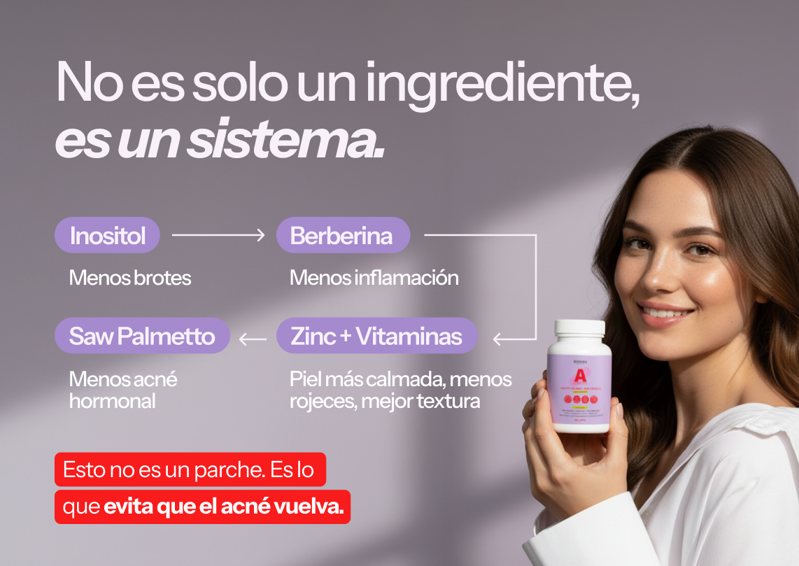 – Regula el exceso de andrógenos (hormonas que favorecen granos, sebo y vello)